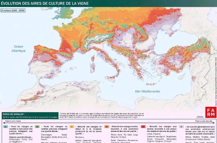 Χρησιμοποιώντας το σενάριο RCP 8.5 της Διακυβερνητικής Επιτροπής για την Κλιματική Αλλαγή (IPCC) και τον δείκτη Winkler για τη χαρτογράφηση των αμπελουργικών περιοχών των επόμενων δεκαετιών, ο Serge Zaka υπολογίζει ότι η καλλιεργητική περίοδος της αμπέλου θα μπορούσε να μειωθεί κατά 20 35 ημέρες μετά το 2060 , «με μια φαινολογική μετατόπιση και καταστροφικούς όψιμους παγετούς στη Βόρεια Ακτή». Λαμβάνοντας υπόψη με τους μελετητές του* ότι «η άρδευση αμπέλου από μόνη της δεν μπορεί να αποτελέσει μια μεσοπρόθεσμη ή μακροπρόθεσμη στρατηγική για την αντιμετώπιση του υδατικού στρες σε ένα πλαίσιο έλλειψης πόρων και αυξανόμενων αναγκών σε νερό», ο Serge Zaka καλεί τους αμπελουργούς να εξερευνήσουν διάφορους μοχλούς (χρήση πιο ανθεκτικών ποικιλιών και υποκειμένων αμπέλου, αγροοικολογικές πρακτικές που συντηρούν το έδαφος κ.λπ.) για να σωθεί ό,τι μπορεί να σωθεί, αλλά δεν αποκλείει τη μετεγκατάσταση αρκετών αμπελώνων σε νέα εδάφη.