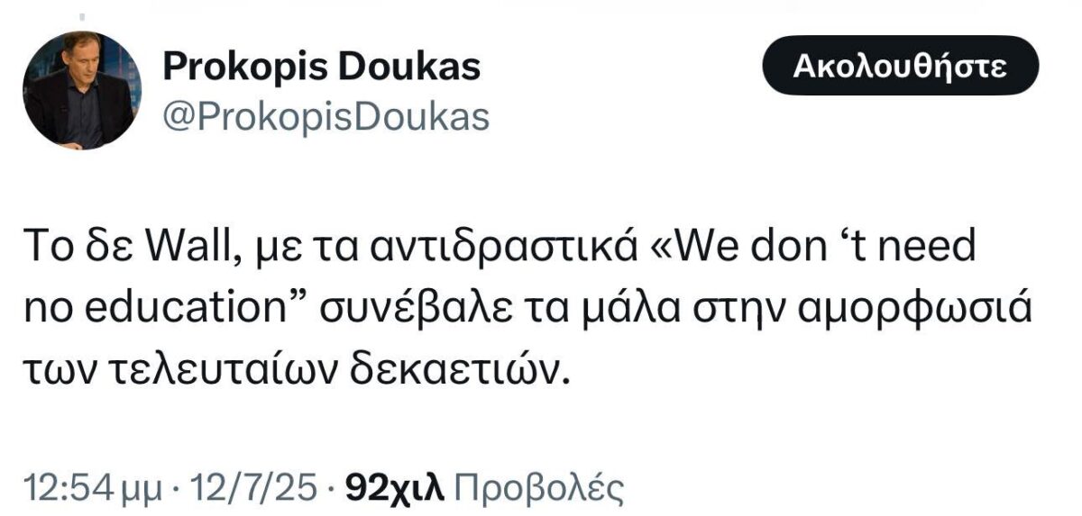 Σχολιάζοντας έναν από τους σημαντικότερους δίσκους της ροκ μουσικής και του μουσικού πενταγράμμου γενικότερα, ο κ. Δούκας υποστήριξε, ούτε λίγο ούτε πολύ, ότι το περιεχόμενό του είναι «αντιδραστικό» και «συνέβαλε τα μάλα στην αμορφωσιά των τελευταίων δεκαετιών» (βλ. σχετική φωτό 1). Αιτιολογώντας, ο ίδιος επικαλέστηκε στίχους της ιστορικής ροκ όπερας των Floyd, όπως το πασίγνωστο απόσπασμα «We don’t need no education, we don’t need no thought control» από το εμβληματικό τραγούδι «Another Brick in the Wall, Part 2», κατηγορώντας τους ότι δήθεν ευθύνονται για το χαμηλό μορφωτικό επίπεδο των γενεών που ασπάστηκαν «τοις μετρητοίς» τέτοιες μουσικές μέχρι και σήμερα…
