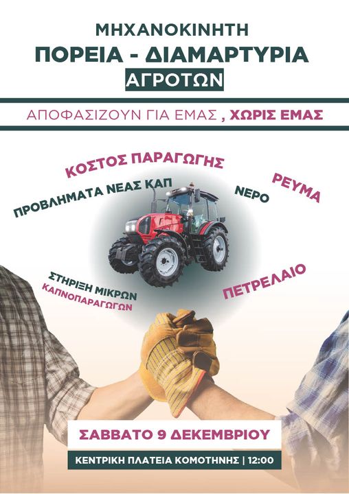 Εν τω μεταξύ, μηχανοκίνητη πορεία με κατάληξη στην πλατεία Ειρήνης, στην Κομοτηνή, ετοιμάζουν αγρότες της Ροδόπης το Σάββατο 9 Δεκεμβρίου στις 12:00, για να μεταφέρουν το μήνυμά τους προς πάσα κατεύθυνση.