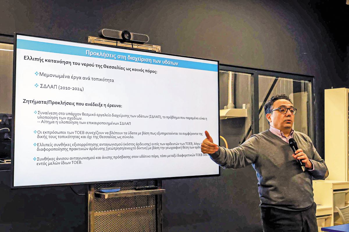 Στη διαβούλευση παρέστη και ο καθηγητής του Γεωπονικού Πανεπιστημίου Αθηνών και νέος πρόεδρος του Οργανισμού Διαχείρισης Υδάτων Θεσσαλίας (ΟΔΥΘ), Νίκος Δέρκας, ο οποίος συνοδευόταν από τον αντιπρόεδρο του νέου Οργανισμού, Θανάση Μαρκινό.