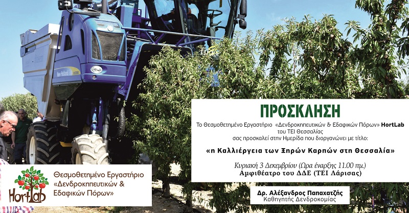 Το μόνο για την Ελλάδα, Θεσμοθετημένο και με ISO 9001, Εργαστήριο “Δενδροκηπευτικών & Εδαφικών Πόρων” HortLab του ΤΕΙ/Θεσσαλίας, διοργανώνει την Κυριακή 3 Δεκεμβρίου και από τις 11.00 το πρωί, ανοιχτή Ημερίδα στο ΤΕΙ Θεσσαλίας στην Λάρισα, για την Σύγχρονη Καλλιέργεια των Ξηρών Καρπών.
