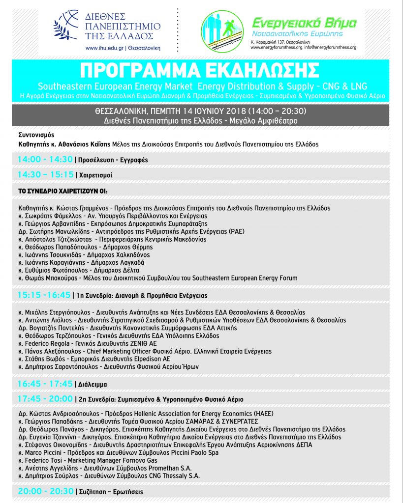 Το Ενεργειακό Βήμα Νοτιοανατολικής Ευρώπης και το Διεθνές Πανεπιστήμιο της Ελλάδος διοργανώνουν Συνέδριο με τίτλο «Η Αγορά Ενέργειας στην Νοτιοανατολική Ευρώπη Διανομή & Προμήθεια Ενέργειας // Συμπιεσμένο & Υγροποιημένο Φυσικό Αέριο» στα πλαίσια των δράσεων για το 2018.