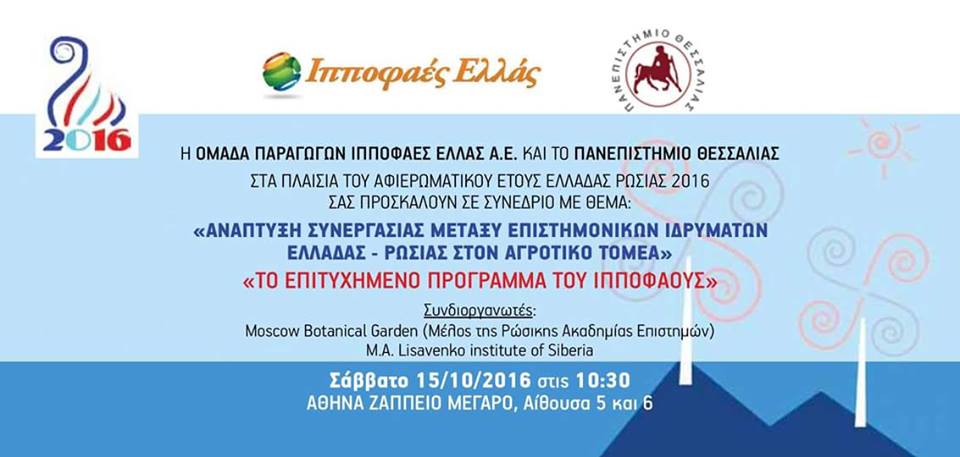 Η ομάδα παραγωγών Ιπποφαές Ελλάς Α.Ε. και το Πανεπιστήμιο Θεσσαλίας διοργανώνουν το Σάββατο 15/10 στις 10.30 στο Ζάππειο Μέγαρο συνέδριο με θέμα «Ανάπτυξη συνεργασίας μεταξύ επιστημονικών ιδρυμάτων Ελλάδας – Ρωσίας στον αγροτικό τομέα. Το επιτυχημένο πρόγραμμα του Ιπποφαούς».