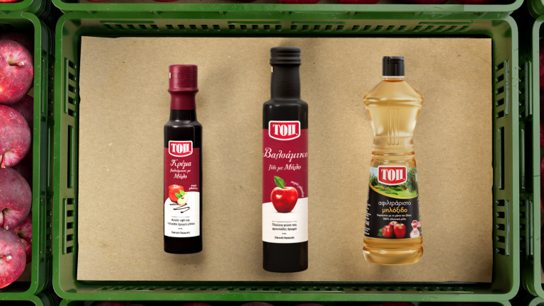Το ΤΟΠ βαλσάμικο με Μήλο, σε γυάλινη συσκευασία 250ml, προσδίδει στις γευστικές δημιουργίες μας το έντονο φρουτώδες άρωμα του μήλου, ενώ η ΤΟΠ Κρέμα βαλσάμικου με Μήλο, σε πλαστική συσκευασία 200ml, μεταφέρει στα πιάτα μας την απαλή υφή και το ντελικάτο άρωμα του μήλου.