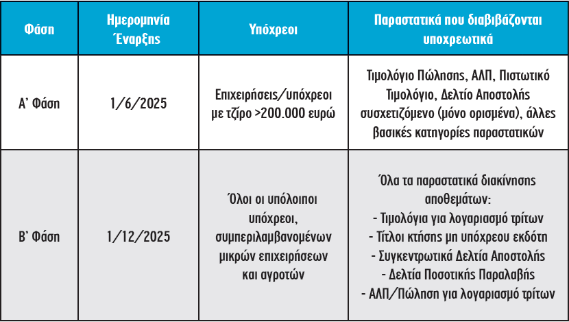 - Β’ φάση: Πλήρης εφαρμογή από 1/5/2026 για όλους τους υπόχρεους.