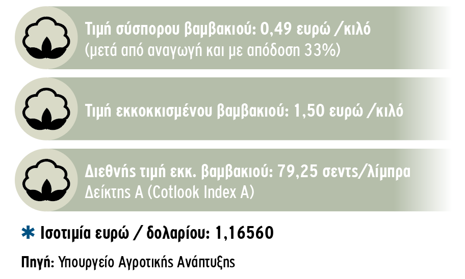 Η συγκομιδή βρίσκεται, αυτήν τη στιγμή, στο 80% σε πανελλαδικό επίπεδο, με τις αποδόσεις, όπως είχε εκτιμηθεί αρχικά, να είναι ελαφρώς μειωμένες σε σχέση με πέρυσι. Η χειρότερη εικόνα έρχεται από τη Στερεά Ελλάδα όπου το 70% των βαμβακιών έχει συλλεχθεί και απομένει ένα 30% από δεύτερο χέρι. «Είχαμε πολλές προσβολές από το πράσινο σκουλήκι κι ένα μεγάλο ποσοστό των παραγωγών είναι πολύ πιθανό να μην πιάσει το ‘‘κατώφλι’’ για τη συνδεδεμένη (231 κιλά)», λέει στην «ΥΧ» ο πρόεδρος του ΑΣ Ορχομενού, Βασίλης Τσαγαλάς.