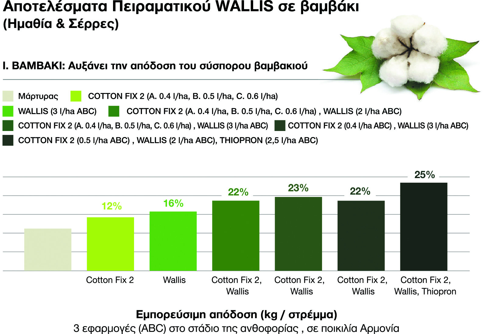 Το WALLIS είναι ένα εξειδικευμένο προϊόν θρέψης παρασκευασμένο με την υψηλής ποιότητας τεχνολογία GoActiv, μια μοναδική διαδικασία εκχύλισης, σχεδιασμένη να διατηρεί αναλλοίωτα τα ενεργά συστατικά. Με την εφαρμογή του Wallis στην καλλιέργεια του βαμβακιού: