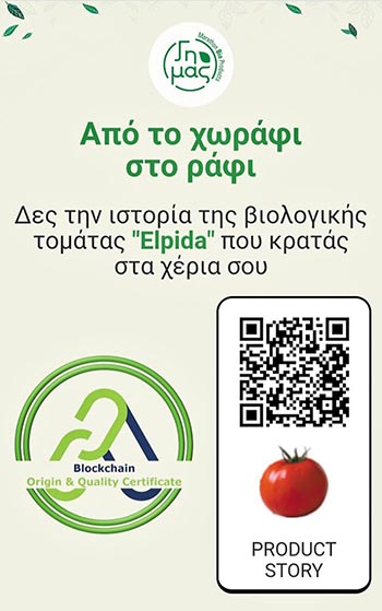 Παράλληλα, ο παραγωγός διαθέτει πληθώρα πληροφοριών για όλα τα παραγωγικά στάδια του προϊόντος, έχοντας τη δυνατότητα να επέμβει όπου και εφόσον χρειαστεί. Πρόκειται για μια εφαρμογή του Blockchain που υλοποιείται για πρώτη φορά, σε πανευρωπαϊκό επίπεδο, στο στάδιο της αγοράς για τη βιολογική ντομάτα».