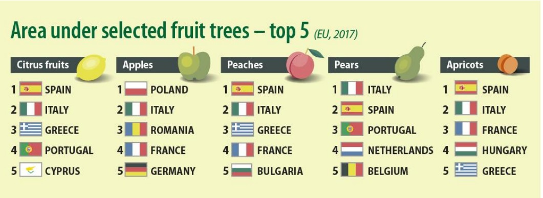 Τα 2/3 των καλλιεργήσιμων εκτάσεων με οπωροφόρα στην ΕΕ συγκεντρώνουν η Ισπανία (4.228.000 στρ.), η Ιταλία (2.793.000 στρ.) και η Πολωνία (6730.000 στρ.). Την ίδια στιγμή, η Ελλάδα συμπεριλαμβάνεται στην πρώτη πεντάδα με τις μεγαλύτερες καλλιέργειες εσπεριδοειδών, ροδάκινων και βερίκοκων.