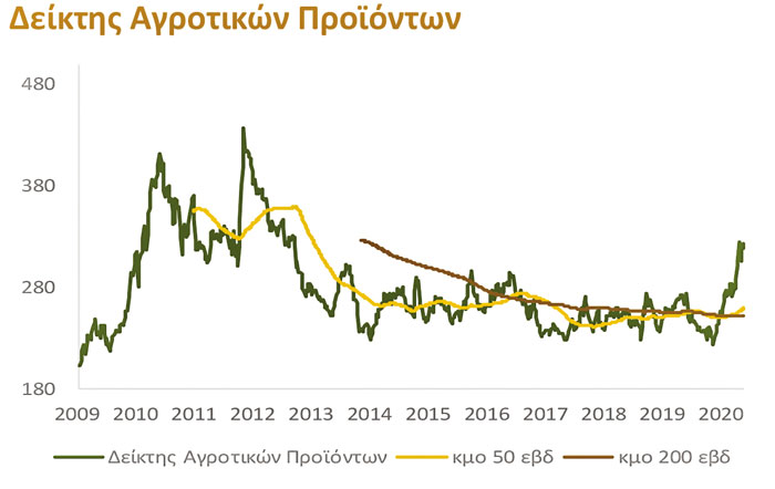 Πάντως, σύμφωνα με την τράπεζα, οι τιμές των αγροτικών προϊόντων βρίσκονται σε ανοδική τροχιά, υποβοηθούμενες από την υπερβάλλουσα ζήτηση σε σχέση με την προσφορά, τα καλά μακροοικονομικά στοιχεία στην Κίνα και τη χαλαρή νομισματική πολιτική της Fed. Παρ’ όλα αυτά, η ανοδική τάση είναι απότομη και η αγορά σε σχετικά υπεραγορασμένα επίπεδα.
