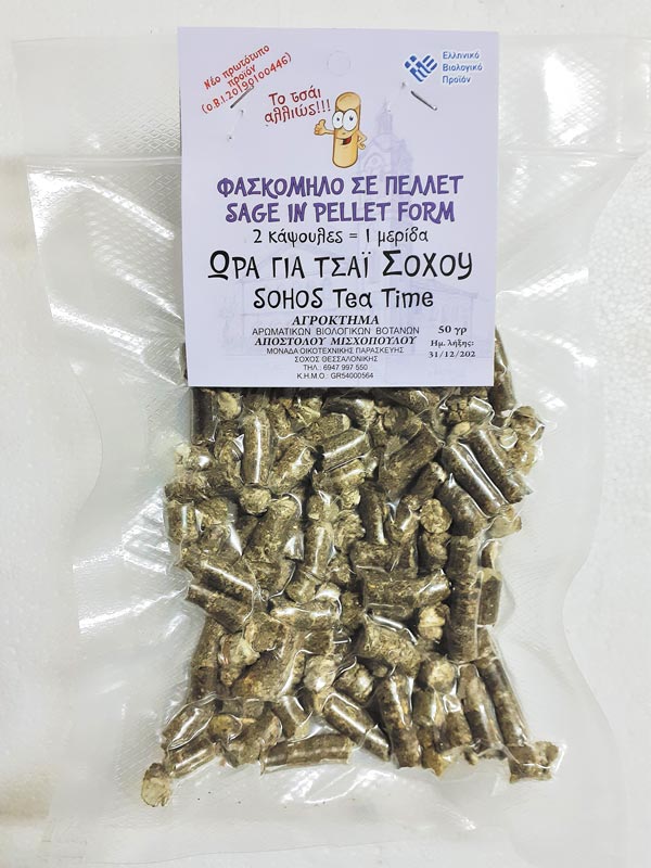 Το τσάι του Ολύμπου, του Παρνασσού, το θυμάρι, το φασκόμηλο, το χαμομήλι, το κουφόξυλο, βότανα που καλλιεργούνται σε ένα βιολογικό αγρόκτημα 15 στρεμμάτων, είναι διαθέσιμα σε μια νέα μορφή που παραπέμπει στο φυσικό και εναλλακτικό καύσιμο, το πέλλετ (pellet).