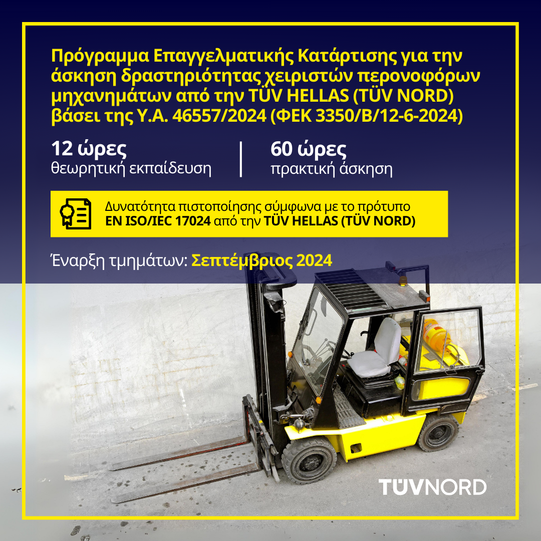 Τη δυνατότητα σε ενδιαφερόμενους επαγγελματίες να εκπαιδευθούν, να εξεταστούν και να αποκτήσουν τη σχετική άδεια, που προβλέπει ο νόμος 4982/2022, ως χειριστές περονοφόρων ανυψωτικών μηχανημάτων προσφέρει το σχετικό πρόγραμμα της TÜV HELLAS (TÜV NORD).