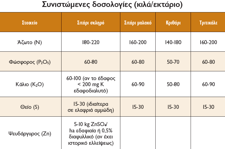 Σε ελληνικές συνθήκες, οι ανάγκες για σιτηρά κυμαίνονται περίπου στις 16-20 μονάδες/στρέμμα (όπου μία μονάδα ισοδυναμεί με 1 kg N/στρέμμα). Η χορήγηση πλήρους ποσότητας νωρίς επιφέρει κινδύνους στην καλλιέργεια, αν το έδαφος είναι ψυχρό ή υγρό ή όταν το άζωτο μπορεί να μετακινηθεί ή να απολεσθεί. Γι’ αυτό, η βασική λίπανση δεν καλύπτει όλη την ποσότητα αζώτου που πρέπει να δεχθεί η καλλιέργεια, καθώς το υπόλοιπο δίνεται με επιφανειακές εφαρμογές την άνοιξη. Ο φώσφορος είναι κρίσιμος για την ανάπτυξη του ριζικού συστήματος, την άνθιση και τη μεταφορά ενέργειας εντός του φυτού. Επειδή δεν κινείται εύκολα στο έδαφος, η χορήγησή του πρέπει να γίνει κατά τη βασική λίπανση. Συνιστώνται περίπου 3-5 μονάδες P/στρέμμα για τα σιτηρά ή 6-8 μονάδες, όταν κρίνεται απαραίτητο. Η μορφή του φωσφόρου πρέπει να είναι υδατοδιαλυτή (όπως DAP, τριπλό υπερφωσφορικό), ώστε να είναι διαθέσιμο στα φυτά.