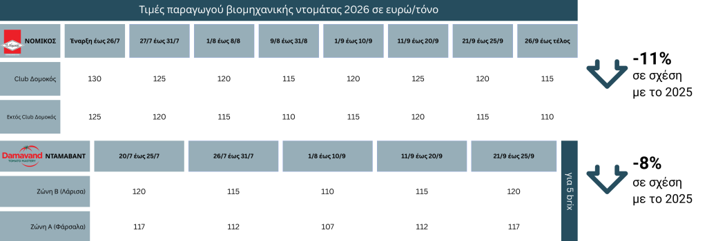 Μειωμένες τιμές κατά 15 ευρώ τον τόνο (περίπου -1%) σε σχέση με το 2025 ανακοίνωσαν οι εταιρείες ΑΒΕΚ Δ. Νομικός και Damavand για τη σοδειά της βιομηχανικής ντομάτας του 2026. Οι τιμές για παράδοση ντομάτας στο εργοστάσιο των Φαρσάλων της Νομικός κυμαίνονται μεταξύ 130 και 115 ευρώ/τόνο για τους παραγωγούς που ανήκουν στο «Club Δομοκός» και μεταξύ 125 και 110 ευρώ/τόνο για όσους είναι εκτός του «Club Δομοκός». Οι τιμές για παράδοση στο εργοστάσιο της Φιλίας Καρδίτσας της Damavand κυμαίνονται μεταξύ 120 και 110 ευρώ/τόνο για τους παραγωγούς της Λάρισας και μεταξύ 117 και 107 ευρώ/τόνο για τους παραγωγούς των Φαρσάλων.