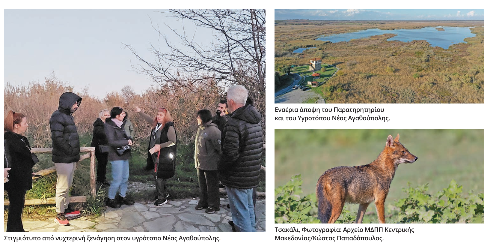 Η ξενάγηση ξεκινά με απογευματινή ορνιθοπαρατήρηση και περίπατο για αναγνώριση χλωρίδας και πανίδας, στη διάρκεια μιας πεζοπορίας περίπου 40 λεπτών μέσα στον υγρότοπο. Μεταξύ των ζώων που απαντούν στον υγρότοπο της Νέας Αγαθούπολης είναι και το τσακάλι, οι αριθμοί του οποίου έχουν αυξηθεί στην περιοχή τα τελευταία χρόνια. Οι συμμετέχοντες θα ενημερωθούν για τις συνήθειες αυτού του ξεχωριστού ζώους, το οποίο -όπως και άλλα άγρια είδη- έχει περιβληθεί συχνά με μύθους που το αδικούν.