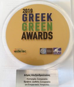 Στο πλαίσιο των «Greek Green Awards 2019», ο Δήμος Αλεξανδρούπολης απέσπασε το Βραβείο Διεθνούς Συνεργασίας για Ενεργειακές Υπηρεσίες στην κατηγορία «Συνεργασία», αναφορικά με την συμμετοχή του Δήμου στο Ευρωπαϊκό Έργο IRIS” (IntegratedandReplicableSolutionsforCo-CreationinSustainableCities), το οποίο χρηματοδοτείται από το Πρόγραμμα Ορίζοντας 2020. Το βραβείο παρέλαβε ο Αντιδήμαρχος Τραϊανούπολης, Ενέργειας και Φυσικών Πόρων, κ. Ιωάννης Φαλέκας.