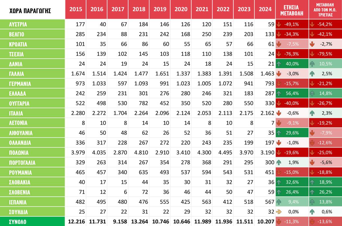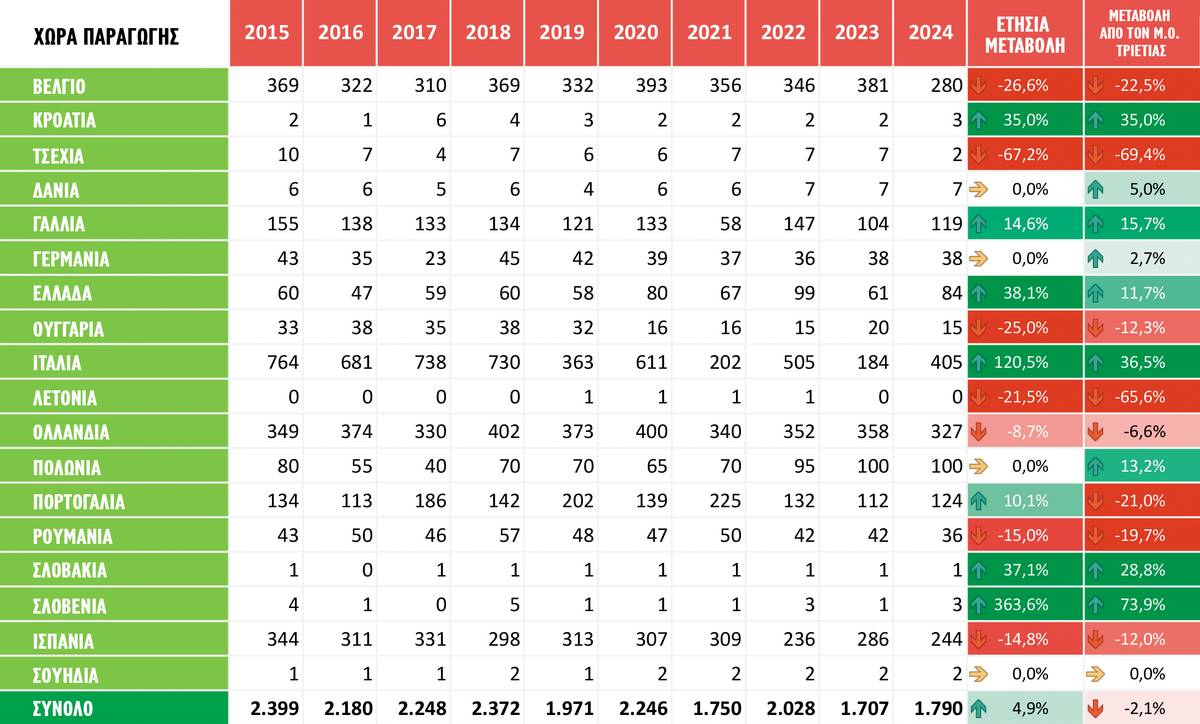 Η παραγωγή που προβλέπεται ανέρχεται στους 1,79 εκατ. τόνους, ποσότητα, βέβαια, χαμηλότερη κατά 2,1% από τον μέσο όρο της τελευταίας τριετίας. Οι βελτιωμένοι όγκοι αποδίδονται σε μεγάλο βαθμό στην ανάκαμψη της ιταλικής παραγωγής από τα «καταστροφικά» επίπεδα του 2023 (+120,5%), με τις φετινές ποσότητες (405.000 τόνοι) της γείτονος να ξεπερνούν κατά 36,5% τον μέσο όρο της τριετίας.