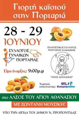 Στο πεδινό χωριό της Πορταριάς της Χαλκιδικής, εκεί όπου όλοι οι κάτοικοι έχουν ως κύρια ενασχόληση την καλλιέργεια της ελιάς και του βερίκοκου πραγματοποιείται κάθε χρόνο τέτοια εποχή η παραδοσιακή γιορτή του καϊσιού, την οποία διοργανώνουν ο Σύλλογος Γυναικών και ο Πολιτιστικός Σύλλογος Πορταριάς Χαλκιδικής. «Η γιορτή καϊσιού τιμά, προβάλλει και προωθεί ένα χαρακτηριστικό προϊόν της περιοχής μας, αφού εκατοντάδες στρέμματα δέντρων βερικοκιάς καλλιεργούνται στα γόνιμα χωράφια της Πορταριάς. Τιμά και γιορτάζει την αγροτική παραγωγή μας», τονίζει η πρόεδρος του Συλλόγου Γυναικών, Γιώτα Λουκά.