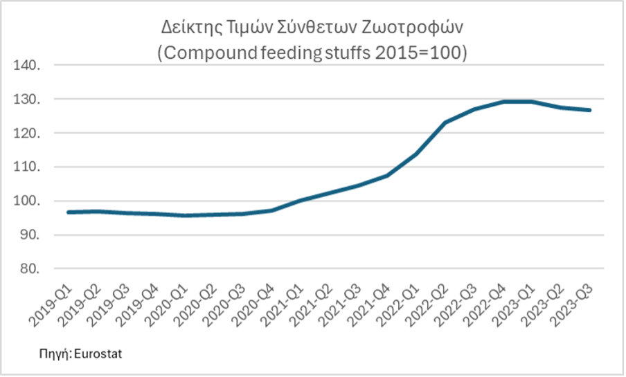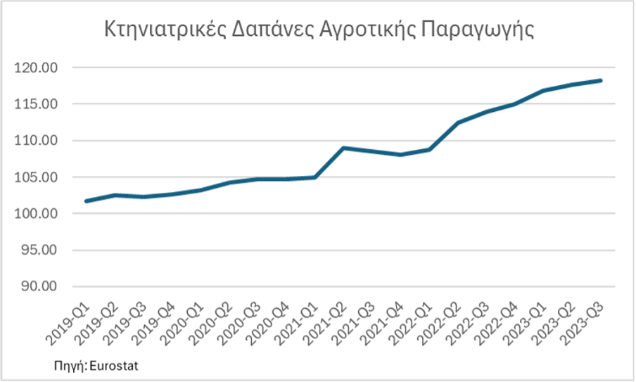 Σύμφωνα με την Eurostat, στην Ελλάδα τόσο ο δείκτης τιμών σύνθετων ζωοτροφών όσο και ο δείκτης κτηνιατρικών δαπανών παρουσιάζουν αυξητική τάση από το 2020 και μετά. Ειδικότερα, ο δείκτης σύνθετων ζωοτροφών αυξήθηκε από 96 μονάδες το 2020 σε 127 μονάδες έως και το τρίτο τρίμηνο του 2023 (ποσοστιαία αύξηση κατά 33%), ενώ ο δείκτης κτηνιατρικών δαπανών αυξήθηκε από 104 μονάδες το 2020 σε 117 μονάδες έως και το τρίτο τρίμηνο του 2023 (ποσοστιαία αύξηση κατά 13%)».