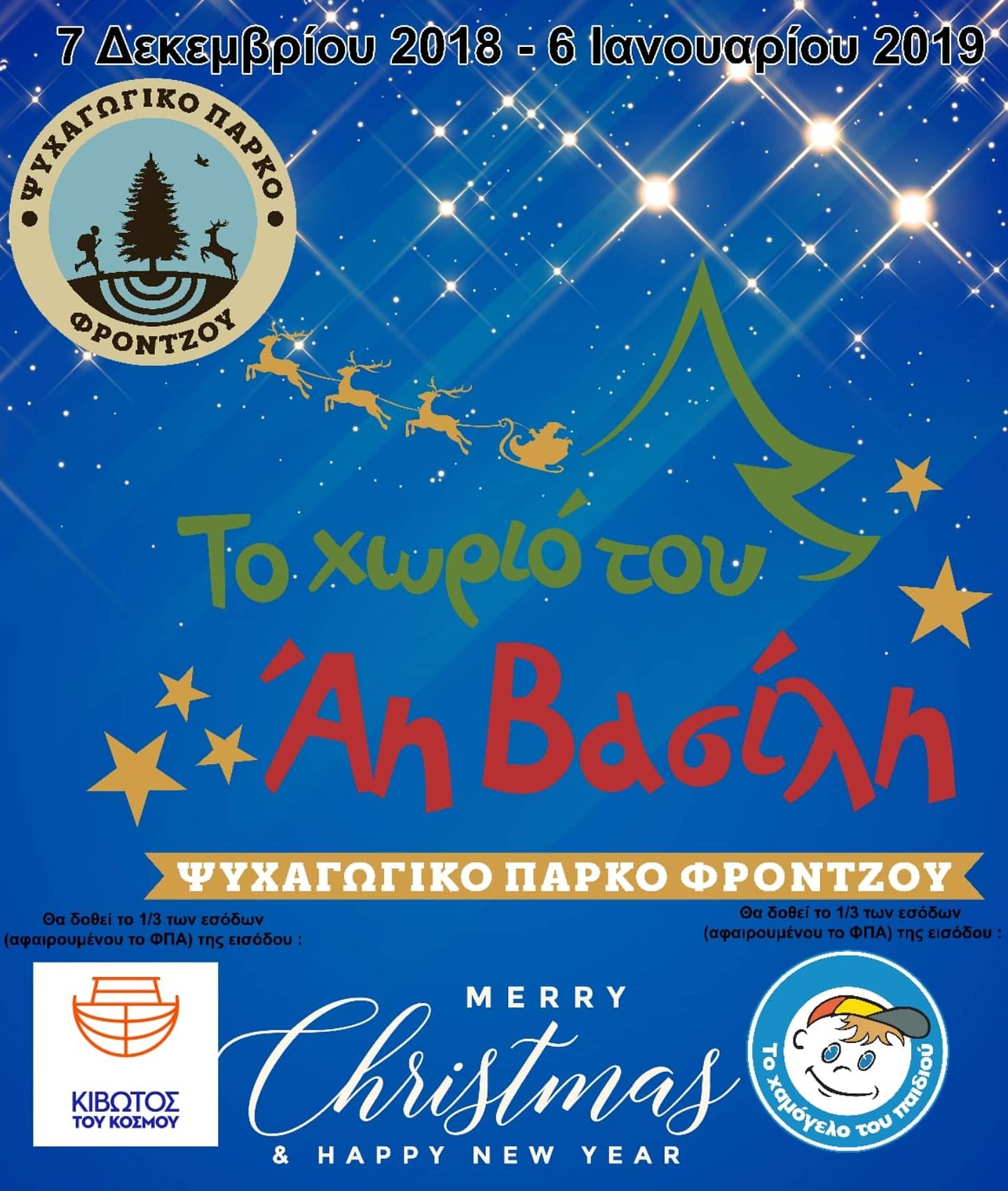 Η είσοδος στο «Χωριό του Άη Βασίλη» θα κοστίζει 1€. Το 1/3 των εσόδων της εισόδου (αφαιρούμενο το ΦΠΑ) θα διατεθεί στο Χαμόγελο του Παιδιού και το 1/3 των εσόδων της εισόδου (αφαιρούμενο το ΦΠΑ) θα διατεθεί στην Κιβωτό του Κόσμου.