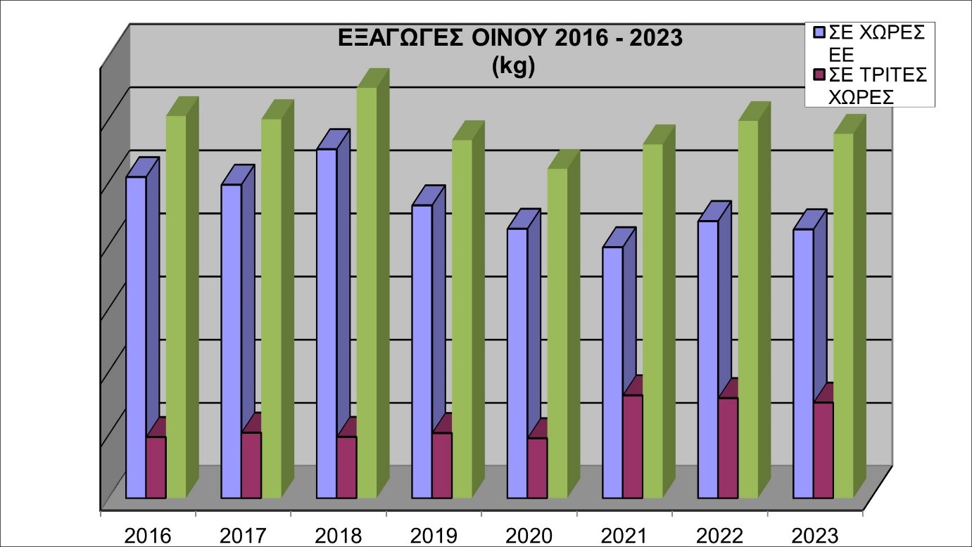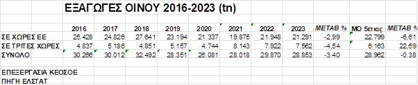 Μικρή αύξηση, (σύμφωνα με τους  πίνακες που ακολουθούν) της τάξης του 0,73% σε αξία (98.972.279 €/2022 – 99.692.240 €/2023), αλλά μείωση της τάξης του -3,40% σε ποσότητα (29.870 tn/2022 – 28.853 tn/2023), παρουσιάζουν τα εξαγωγικά μεγέθη του ελληνικού κρασιού το 2023 έναντι του 2022, λαμβάνοντας υπόψιν ότι το 2022 οι εξαγωγές αυξήθηκαν σημαντικά κατά 16,75% έναντι του 2021, εξαιτίας των επιπτώσεων της πανδημίας covid 19, που επέδρασε μειώνοντας τα αντίστοιχα  μεγέθη του 2020 και του 2021.