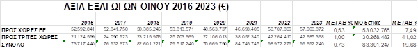 Σε αξία οι ελληνικές αποστολές οίνων προς χώρες της Ε.Ε. το 2023 παρουσιάζουν ανεπαίσθητη αύξηση της τάξης του 0,53% (57.006.872 € /2023 – 56.707.869 €/2022), ενώ συνεχίζουν να παρουσιάζουν αύξηση της τάξης του 7,49% σε σχέση με το μέσο όρο της προηγούμενης 5ετίας.
