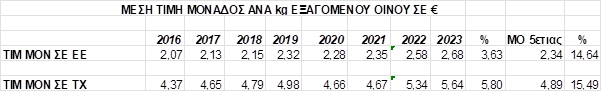 Τέλος αυξητική καταγράφεται, η εξέλιξη της μέσης τιμής μονάδος, ανά εξαγόμενο  κιλό οίνου. Το 2023 παρουσιάζει  αύξηση κατά 5,8% (5,64 €/kg/2023 – 5,34 €/kg/2022), ενώ η αυξητική τάση της μέσης τιμής μονάδος καταγράφεται σε σχέση και με την προηγούμενη 5ετία που ανέρχεται σε 15,49% (Μέσος Όρος τιμής 5ετίας 4,89 €/kg), γεγονός που σταθεροποιεί την διαχρονική άνοδο της μέσης τιμής, επιτυγχάνοντας εν μέρει το στόχο της αύξησης της αντιλαμβανόμενης αξίας του ελληνικού οίνου, στις αγορές των ΗΠΑ και του Καναδά.