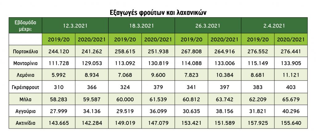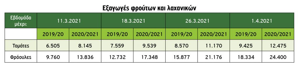 Επίσης, συνεχίζεται με αυξητικούς ρυθμούς η εξαγωγή φράουλας και από 1/1 έως 1/4/2021 ανήλθαν σε 24.400 τόνους έναντι 18.334 τ. αντίστοιχα πέρσι.