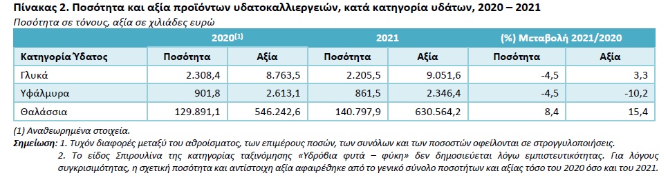 Θαλάσσια ύδατα: η ποσότητα και η αξία παρουσίασαν αύξηση 8,4% και 15,4% αντίστοιχα, το 2021 σε σχέση με το 2020. Συγκεκριμένα, το 2021 καλλιεργήθηκαν140.797,9 τόνοι συνολικής αξίας 630.564,2 χιλ. ευρώ, έναντι 129.891,1 τόνων συνολικής αξίας 546.242,6 χιλ. ευρώ το 2020.