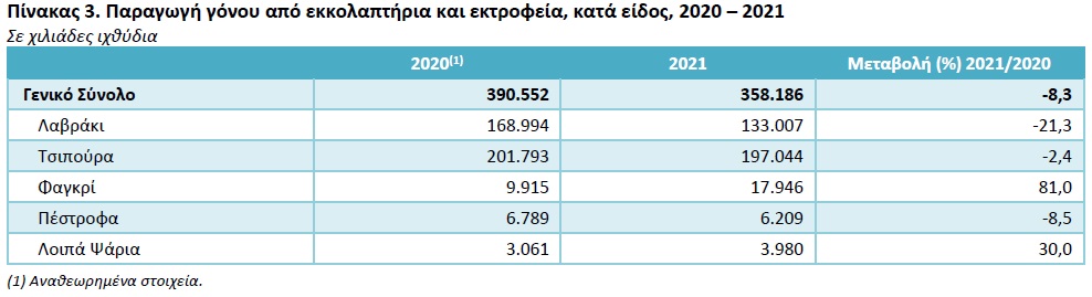 Λαβράκι: μείωση 21,3% το 2021 σε σχέση με το 2020. Συγκεκριμένα, ο γόνος για το λαβράκι ανήλθε σε 133.007 χιλιάδες ιχθύδια το 2021, έναντι 168.994 χιλιάδων ιχθυδίων το 2020.