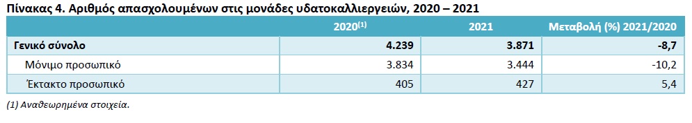 Στο γενικό σύνολο ο αριθμός των απασχολουμένων παρουσίασε μείωση 8,7% το 2021 σε σχέση με το 2020. Συγκεκριμένα, το 2021 το γενικό σύνολο εργαζομένων ανήλθε σε 3.871 έναντι 4.239 εργαζομένων το 2020.