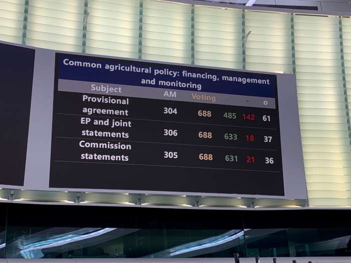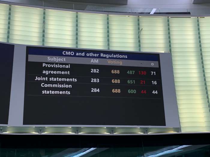 Ο Κανονισμός για τα Στρατηγικά Σχέδια εγκρίθηκε με 452 ψήφους υπέρ, 178 κατά και 57 αποχές, ο Οριζόντιος Κανονισμός με 485 ψήφους υπέρ, 142 κατά και 61 αποχές και ο Κανονισμός για την Κοινή Οργάνωση της Αγοράς με 487 υπέρ, 130. κατά και 71 αποχές.