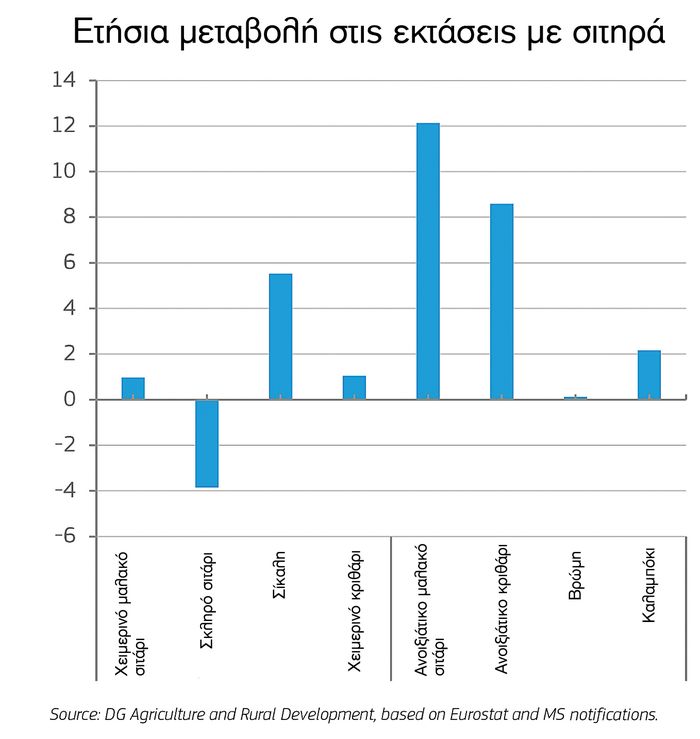 Για την τρέχουσα σεζόν, καταγράφεται ήδη μια αύξηση στις εκτάσεις, η οποία πάντως για το χειμερινό σιτάρι και το κριθάρι δεν ξεπερνά το 1%, με αποτέλεσμα να διαμορφώνονται σε 207 και 48 εκατ. στρέμματα αντίστοιχα, δεδομένου ότι οι σπορές τους είχαν ολοκληρωθεί προτού αρχίσει να εκτυλίσσεται το δράμα στην Ουκρανία.