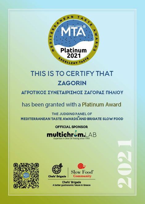 Πλέον η εξαιρετική γεύση των μήλων «ZAGORIN», πιστοποιείται από τη πρόσφατη βράβευση στα πλαίσια της διοργάνωσης Μεσογειακών Βραβείων Γεύσης 2021 (Mediterranean Taste Awards). Τα μήλα του Αγροτικού Συνεταιρισμού Ζαγοράς Πηλίου και συγκεκριμένα αυτά της ποικιλίας Στάρκιν που εξετάστηκαν, κατατάχθηκαν στη πρώτη κατηγορία “Platinum”. ενώ αποτέλεσαν ένα δείγμα ενός γενικότερου συνόλου από 228 προϊόντα, από την Ελλάδα κυρίως, αλλά και τη Γαλλία, την Ισπανία και την Ιταλία.
