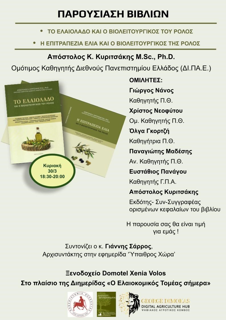 Στο πλαίσιο της διημερίδας θα πραγματοποιηθεί η παρουσίαση των βιβλίων: ‘Το ελαιόλαδο και ο βιολειτουργικός του ρόλος’ και ‘Η επιτραπέζια ελιά και ο βιολειτουργικός της ρόλος’, στα οποία είναι εκδότης και συν-συγγραφέας ορισμένων κεφαλαίων ο Ομότιμος Καθηγητής του Διεθνούς Πανεπιστημίου Ελλάδος κ. Απόστολος Κυριτσάκης.