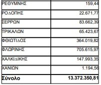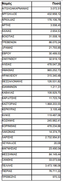 Ακολουθεί ο Πίνακας με τα ποσά ανά Περιφερειακή Ενότητα