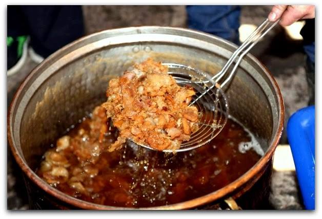 Κόβονται κομμάτια λίπους από τα πιο «παστωμένα» τμήματα του χοιρινού κυρίως στην κοιλιακή χώρα τα οποία έχουν και λίγο κρέας. Τα τοποθετούν στο καζάνι με πολύ φωτιά και αρχίζει να βράζει και έτσι βγάζουν το λίπος το οποίο παλιά το αποθήκευαν για την υπόλοιπη χρονιά. Συγχρόνως, τα μικρά κομμάτια λίπους και κρέατος μειώνονται συνεχώς και στο τέλος ό,τι απομείνει το σβήνουν με καλό κρασί και αυτό για πολλές μέρες είναι ένας καλός και πρόχειρος μεζές που συνοδεύει τα τραπέζια.