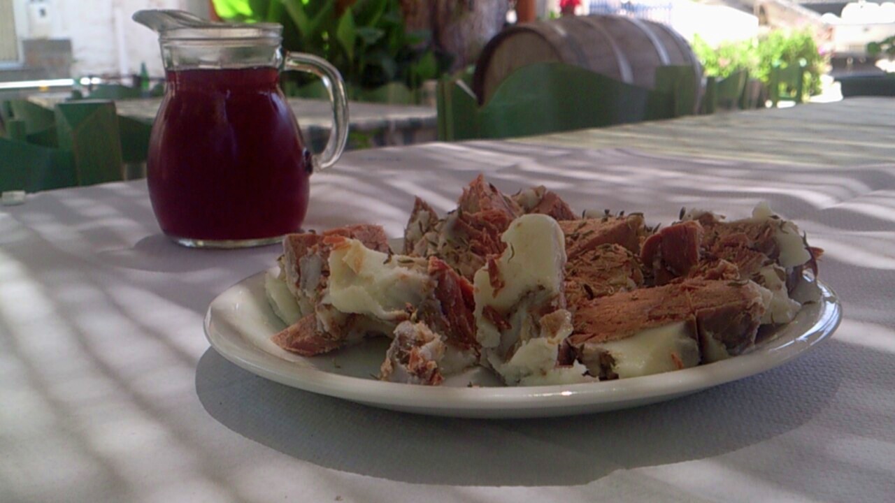 Είναι ένας μεζές που μπορεί να κρατήσει καιρό και να συντροφεύει το κρασί και το τσίπουρο τις κρύες νύχτες του χειμώνα. Είναι παστό χοιρινό κρέας από το κεφάλι συνήθως του ζώου, με αλάτι και πράσο!